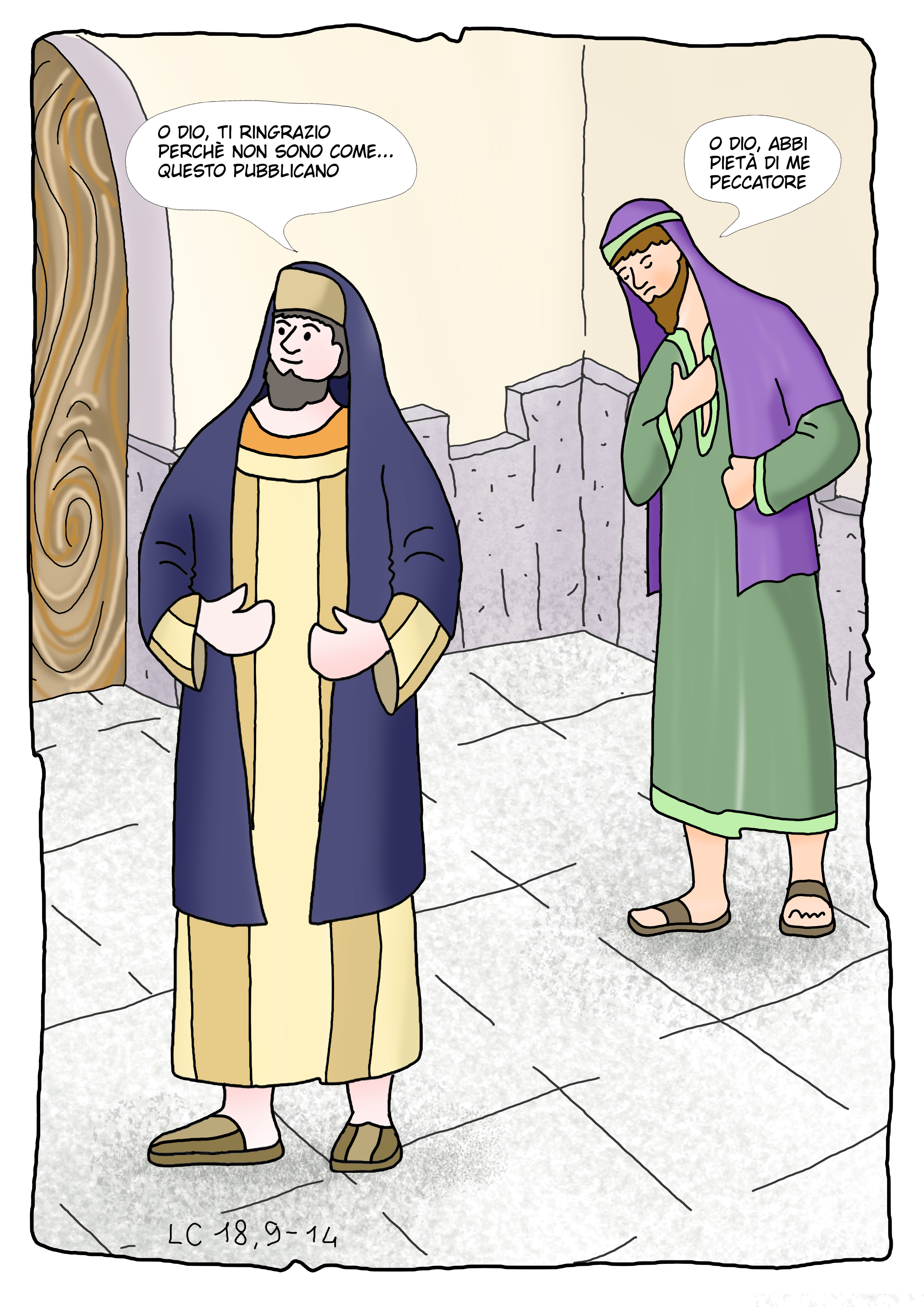 9Disse ancora questa parabola per alcuni che avevano l’intima presunzione di essere giusti e disprezzavano gli altri: 10«Due uomini salirono al tempio a pregare: uno era fariseo e l’altro pubblicano. 11Il fariseo, stando in piedi, pregava così tra sé: “O Dio, ti ringrazio perché non sono come gli altri uomini, ladri, ingiusti, adùlteri, e neppure come questo pubblicano. 12Digiuno due volte alla settimana e pago le decime di tutto quello che possiedo”. 13Il pubblicano invece, fermatosi a distanza, non osava nemmeno alzare gli occhi al cielo, ma si batteva il petto dicendo: “O Dio, abbi pietà di me peccatore”. 14Io vi dico: questi, a differenza dell’altro, tornò a casa sua giustificato, perché chiunque si esalta sarà umiliato, chi invece si umilia sarà esaltato».
