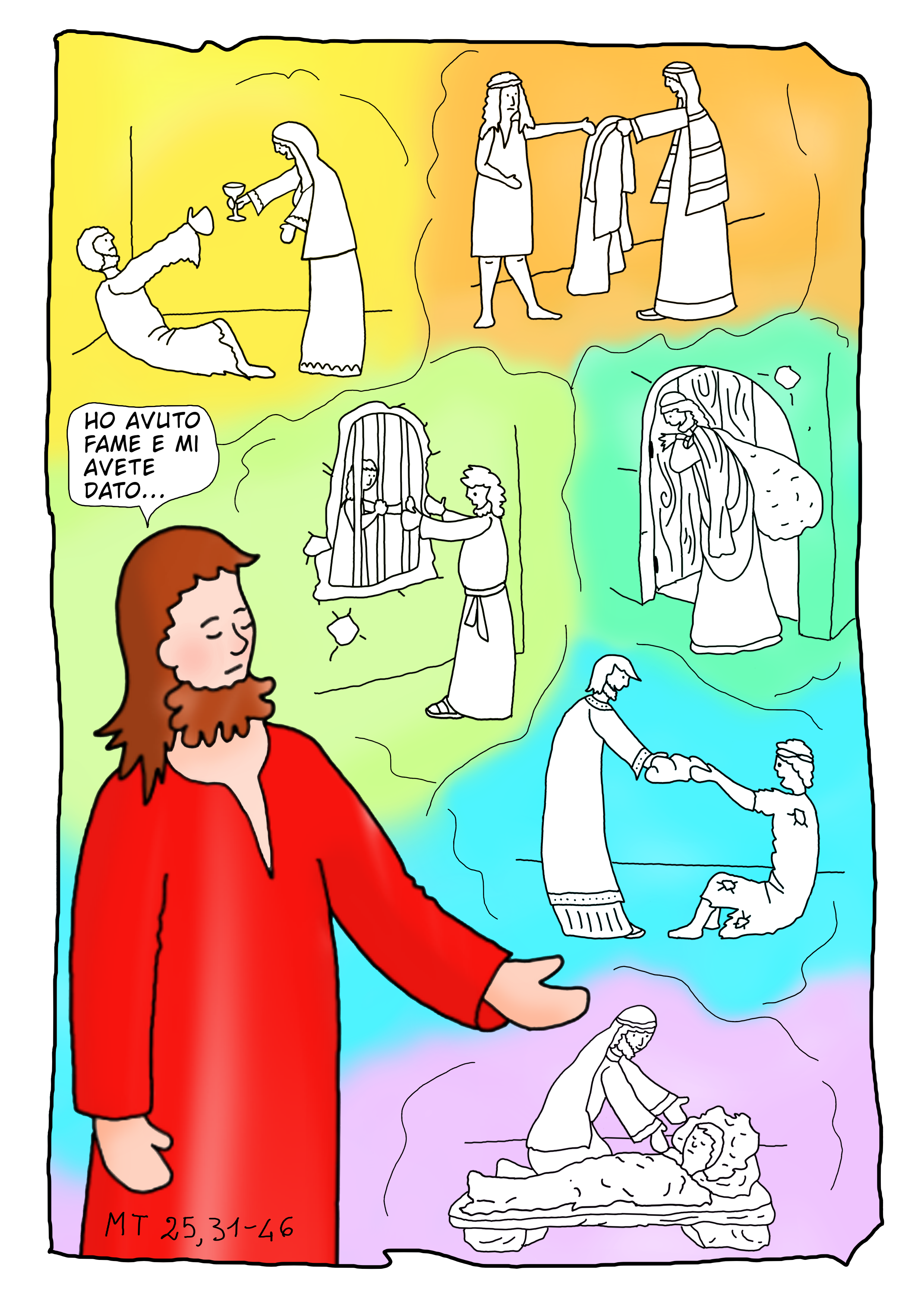 «31Quando il Figlio dell’uomo verrà nella sua gloria, e tutti gli angeli con lui, siederà sul trono della sua gloria. 32Davanti a lui verranno radunati tutti i popoli. Egli separerà gli uni dagli altri, come il pastore separa le pecore dalle capre, 33e porrà le pecore alla sua destra e le capre alla sinistra. 34Allora il re dirà a quelli che saranno alla sua destra: “Venite, benedetti del Padre mio, ricevete in eredità il regno preparato per voi fin dalla creazione del mondo, 35perché ho avuto fame e mi avete dato da mangiare, ho avuto sete e mi avete dato da bere, ero straniero e mi avete accolto, 36nudo e mi avete vestito, malato e mi avete visitato, ero in carcere e siete venuti a trovarmi”. 37Allora i giusti gli risponderanno: “Signore, quando ti abbiamo visto affamato e ti abbiamo dato da mangiare, o assetato e ti abbiamo dato da bere? 38Quando mai ti abbiamo visto straniero e ti abbiamo accolto, o nudo e ti abbiamo vestito? 39Quando mai ti abbiamo visto malato o in carcere e siamo venuti a visitarti?”. 40E il re risponderà loro: “In verità io vi dico: tutto quello che avete fatto a uno solo di questi miei fratelli più piccoli, l’avete fatto a me”. 41Poi dirà anche a quelli che saranno alla sinistra: “Via, lontano da me, maledetti, nel fuoco eterno, preparato per il diavolo e per i suoi angeli, 42perché ho avuto fame e non mi avete dato da mangiare, ho avuto sete e non mi avete dato da bere, 43ero straniero e non mi avete accolto, nudo e non mi avete vestito, malato e in carcere e non mi avete visitato”. 44Anch’essi allora risponderanno: “Signore, quando ti abbiamo visto affamato o assetato o straniero o nudo o malato o in carcere, e non ti abbiamo servito?”. 45Allora egli risponderà loro: “In verità io vi dico: tutto quello che non avete fatto a uno solo di questi più piccoli, non l’avete fatto a me”. 46E se ne andranno: questi al supplizio eterno, i giusti invece alla vita eterna».